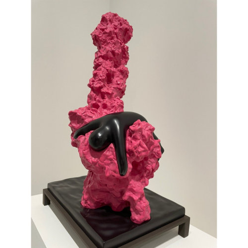 顏色以鮮明對比的粉紅色與黑色呈現,粉紅色部分彷彿熔岩般的動態質感,代表生命力與熱度;黑色部分平滑且沉靜,代表靈魂的重量(當然也有可能就是喝醉躺在那)。