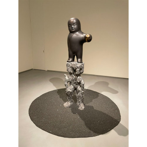 作品結合「人」與「自然的形狀」,上方的人形雕塑象徵靈性或心靈的存在,下方如熔岩或岩石般的結構暗示自然力量與時間的痕跡,整體題材圍繞「內在之物與外在形體的關係」,呼應東方哲學中「虛實相生」的觀念。