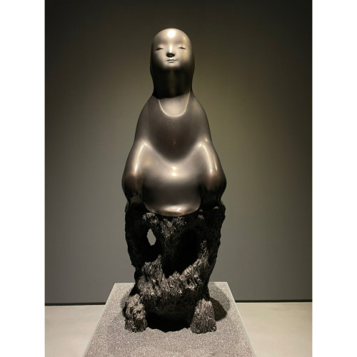 整體造型穩重如山,主體人物坐在表面粗糙的底座上,象徵從世俗物質升華至精神層面,這件作品可能在表達人如何在矛盾、沉重的現實之中,保有內在的光與靜。