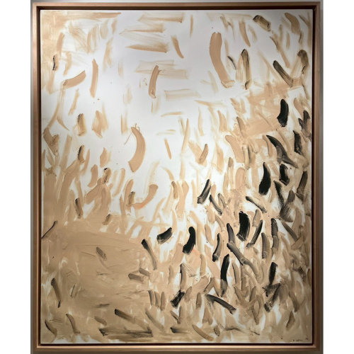整體氛圍明亮中帶有深層節奏感,背景的白與淺棕色帶來開闊與輕盈感,而黑色筆觸的加入則注入力量與動態的方向。