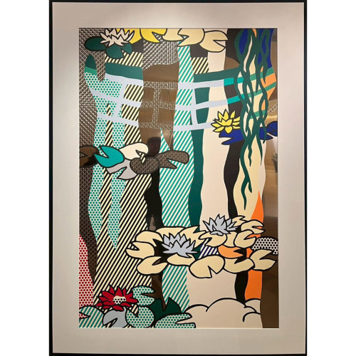 李奇登斯坦以機械印刷般的筆觸重塑自然景象,讓水中睡蓮與橋樑結構交錯,給觀眾在人工與自然之間游移。這件作品對莫內致敬,也是對「觀看方式」與「藝術再現」的幽默。